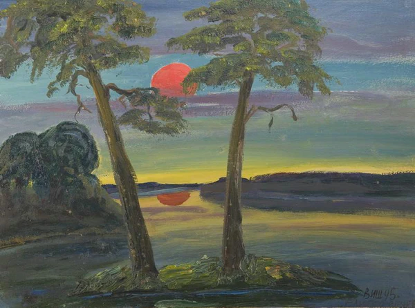 В центре полотна на небольшом островке, расположенном на водной поверхности озера, изображены две сосны. На втором плане отражение заходящего солнца мерцает на водной глади. По краям картины видны берега и острова, густо покрытые растительностью. Небо выполнено в лилово-голубых тонах с ярким красным диском заходящего солнца, что подчёркивает атмосферу вечернего пейзажа.