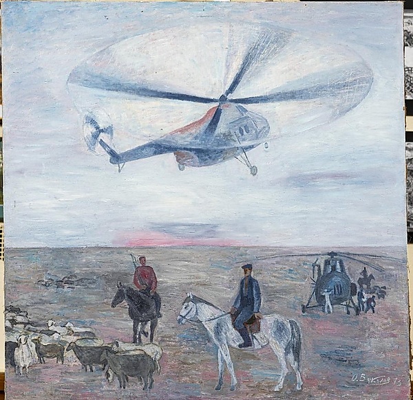 В верхней части композиции изображён серый вертолёт с четырьмя вращающимися лопастями на фоне серо-голубого неба с розовыми пятнами. В центре полотна, на фоне земли, выполненной в серо-голубых и розовых тонах, находится всадник на серой лошади с коричневым потником, а слева — всадник в красной рубахе на чёрной лошади. В левом нижнем углу расположено стадо белых и серых баранов. Справа от центрального всадника на земле стоит ещё один вертолёт, на его фоне выделяется светло-серый силуэт человека, правее — двое людей с белыми свёртками, выше — силуэт всадника, у ног его лошади — три барана и серое пятно. В работе доминирует сдержанная цветовая гамма с преобладанием серых, голубых и розовых оттенков, подчёркивающая повседневный характер сцены.