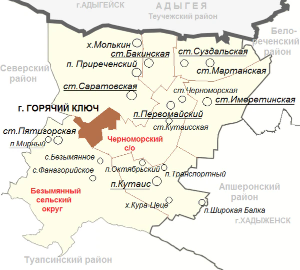 В 1990-е годы подчинённые Горячему Ключу сельсоветы и поссовет (сельские администрации) были преобразованы в сельские округа (при этом Кутаис потерял статус рабочего посёлка (пгт) и вновь стал относиться к сельским населённым пунктам).
