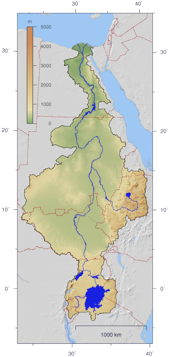 Длина реки Нил определена в 2016 году в 6 852 км, что ставит её на первое место по длине в мире (Амазонка — самая большая по объёму)[4]. Главный источник воды — озеро Виктория. Оттуда река течёт на север и впадает в Средиземное море. Исток реки тяжело определить с полной уверенностью, и считается, что он располагается в лесу Ныунгве в Руанде. Река проходит через 9 стран и множество различных местностей, включая пустыни, болота, тропические леса и горы. У Нила есть два главных притока: Голубой Нил, который берёт начало в Эфиопии, и Белый Нил, который происходит из Руанды. В то время как Белый Нил считается длиннее и легче для передвижения, Голубой Нил несёт примерно две трети объёма воды реки. Название притоков происходит от цвета воды, которую они несут. Притоки соединяются в Хартуме, а устье в Египте снова разветвляется, образуя дельту Нила[5].