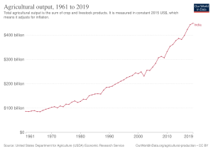 В 2003 году Продовольственная и сельскохозяйственная организация провела анализ развития сельского хозяйства в Индии за период с 1970 по 2001 год. Результаты этого анализа позволили выявить системные проблемы, существующие в индийском аграрном секторе. Годовые темпы роста производства основных продуктов питания за шестилетние периоды с 1970 по 1976, с 1976 по 1982, с 1982 по 1988, с 1988 по 1994 и с 1994 по 2000 годы составили, соответственно, 2,5 %, 2,5 %, 3,0 %, 2,6 % и 1,8 % в год. Аналогичная картина наблюдается и в индексе общего объёма сельскохозяйственного производства: темпы роста в 1994—2000 годах составили лишь 1,5 % в год[29].