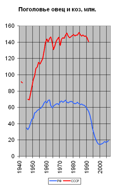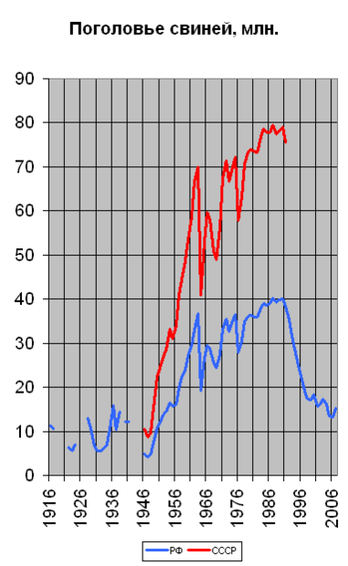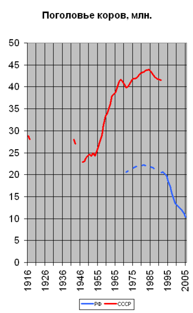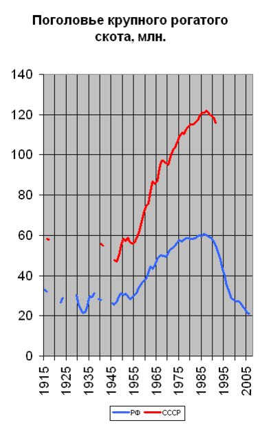 | Годы | Крупный рогатый скот (млн голов) | в том числе коровы (млн голов) | Свиньи (млн голов) | Овцы (млн голов) | Козы (млн голов) | Лошади (млн голов) | Производство мяса (в убойном весе — млн тонн) | Производство молока (млн тонн) |