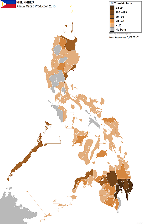С момента появления на Филиппинах какао-дерева началось развитие шоколадной индустрии в стране. История выращивания какао-бобов на Филиппинах началась в эпоху колонизации. Плоды какао, которые изначально произрастали в лесах Центральной Америки, были завезены на Филиппины испанскими завоевателями четыре столетия назад. С тех пор Филиппины стали одним из основных поставщиков какао-бобов в Юго-Восточной Азии. Особенности почвы и климата на Филиппинах создали благоприятные условия для выращивания какао. Шоколадная промышленность страны переживает переход от малого бизнеса к среднему[33].