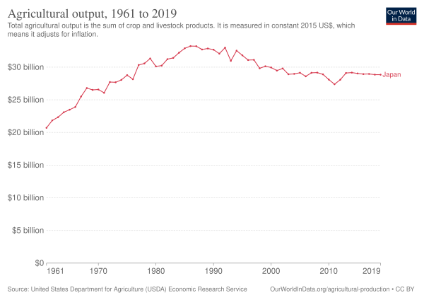 Лишь 20 % территории Японии пригодно для ведения сельского хозяйства, поэтому эта отрасль экономики нуждается в государственной поддержке.