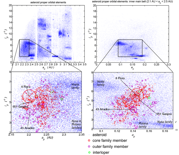 По данным численного статистического HCM анализа (Zappala 1995) для основных членов, расположенных в центральной части семейства, орбитальные элементы лежат в следующих диапазонах: