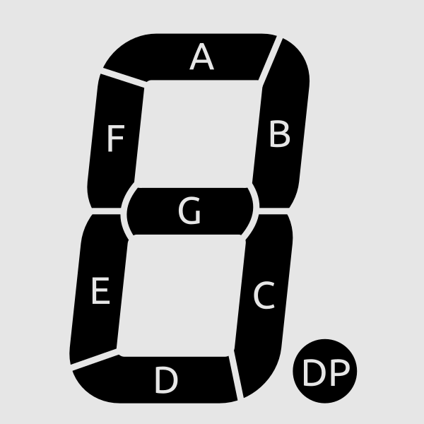 Сегменты обозначаются буквами от A до G; восьмой сегмент — десятичная точка (decimal point, DP), предназначенная для отображения дробных чисел.
