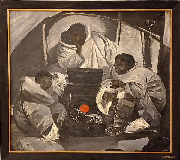 На картине изображена сцена из повседневной жизни: группа из трёх человек и собаки собрались у телефона. Один из персонажей, находящийся справа, запечатлён с сигаретой. В композиции доминирует контраст между черно-белым фоном и ярким красным пятном в центре пластинки, акцентирующим внимание зрителя. Работа выполнена в традициях бытового жанра с использованием выразительных цветовых акцентов в цветовой гамме.