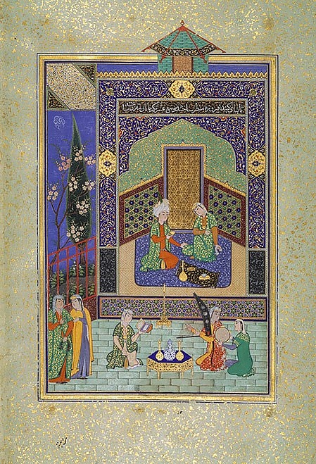 В иллюстрировании повествований о развлечениях Бахрама в семи дворцах художников больше всего привлекали картины увеселений. Сказки же, которые рассказывали принцессы, воспроизводились редко. Миниатюры к рассказам о посещении Бахрамом семи дворцов отличаются в основном своим колористическим решением. В исфаханской «Антологии» 1435—1436 гг. (библиотека Честера Битти) Бахрам шесть раз представлен на коне у каждого дворца (начальный момент действия). Однако часто в миниатюрах изображался пир Бахрама с принцессой или на лоне природы, или же в павильоне[38].