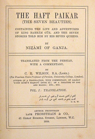 В 1832 году в Казани был опубликован стихотворный немецкий перевод отрывка из поэмы «Бехрам-Гур и русская царевна», выполненный востоковедом Францем Эрдманом, (2-е издание 1844 года там же)[17]. В 1846 году в Лондоне увидела свет посмертная книга долго жившего в Индии и в Иране сэра Гора Оусли «Biographical Notices of Persian Poets». Здесь была изложена, иногда в буквальном переводе, начальная часть поэмы — воспитание Бахрама Гура у соседнего арабского царя Номана, передан по-английски рассказ-сказка китайской царевны о судьбе двух неодинаковых спутников, называвшихся Хейр (Добро) и Шерр (Зло), повесть о царе и визире вместе с рассказами жертв визирского тиранства (это заключительная часть поэмы «Семь красавиц»)[6]. Немецкий филолог Пол Хорн в своей книге «История персидской литературы» («Geschichte der persischen Litteratur», Лейпциг, 1901) привёл довольно выразительное сообщение о содержании поэмы[18].
