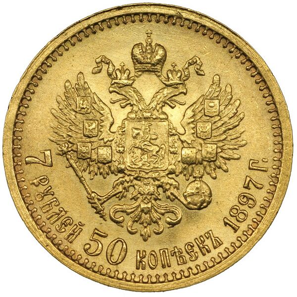 На реверсе монеты размещён герб Российской империи — двуглавый орёл, коронованный двумя императорскими коронами, над которыми Большая императорская корона с двумя развевающимися концами ленты Ордена Святого апостола Андрея Первозванного. На груди орла герб московский: Святой великомученик и победоносец Георгий на коне, поражающий дракона копьём. Вокруг щита цепь ордена святого Андрея Первозванного. На крыльях орла размещены щиты с гербами Царства Казанского, Царства Польского, Царства Херсонеса Таврического, соединённый герб Великих княжеств Киевского, Владимирского и Новгородского, Царства Астраханского, Царства Сибирского, Царства Грузинского и Княжества Финляндского. В лапах орла — скипетр и держава. Под орлом размещена надпись с номиналом монеты «7 РУБЛЕЙ 50 КОПЕЕК» и год её чеканки «1897 Г.». По всему периметру реверса монеты — зубчатый орнамент.