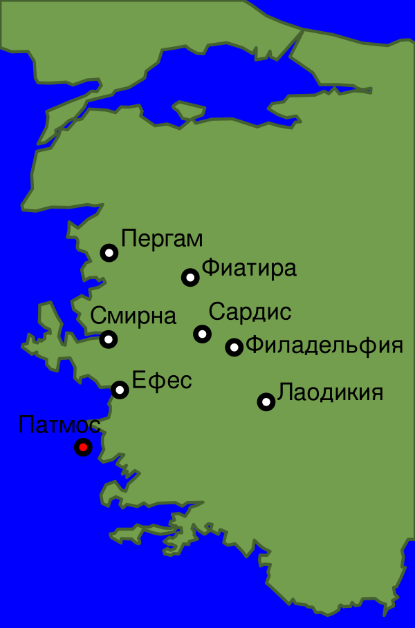 то, что видишь, напиши в книгу и пошли церквам, находящимся в Асии: в Ефес, и в Смирну, и в Пергам, и в Фиатиру, и в Сардис, и в Филадельфию, и в Лаодикию.