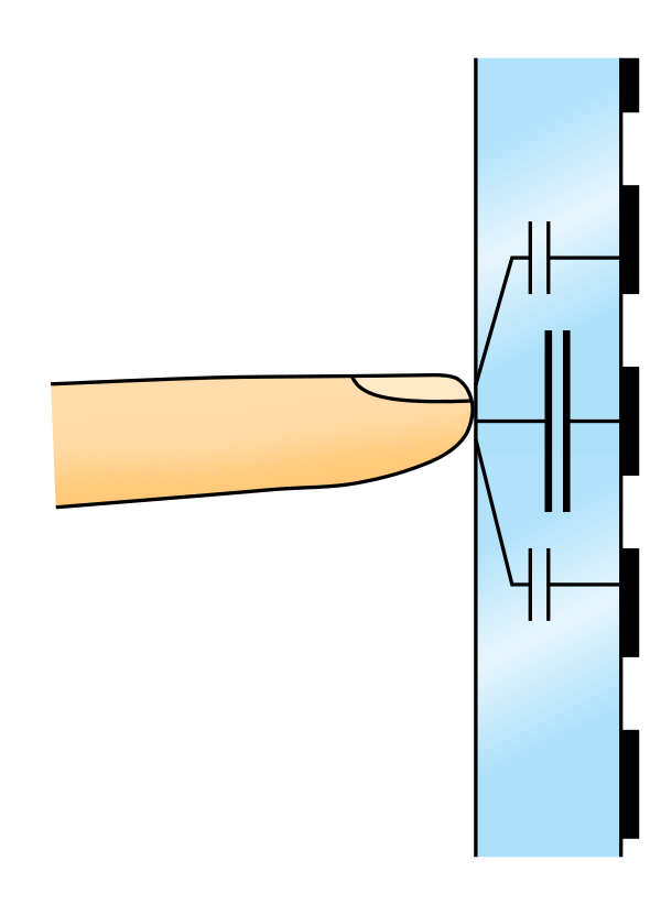 На внутренней стороне экрана нанесена сетка электродов. Электрод вместе с телом человека образует конденсатор; электроника измеряет ёмкость этого конденсатора (подаёт импульс тока и измеряет напряжение).