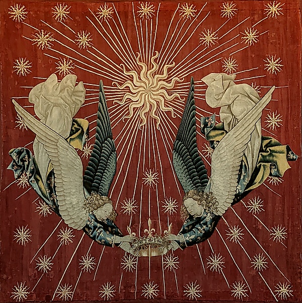На ярко-красном фоне изображено большое золотое солнце в окружении множества звёзд[6], а также два летящих вниз ангела, одежды которых украшены геральдическими лилиями. Ангелы держат украшенную драгоценными камнями корону, увенчанную геральдической лилией: всё указывает на то, что гобелен был соткан для короля Франции. Стилистическое и историческое исследование позволяет сделать вывод, что речь идет о сени Карла VII «Победителя» (1422—1461).