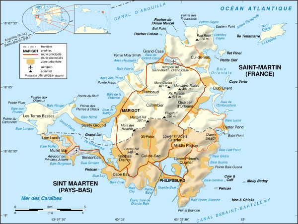 Сен-Мартен сложен вулканическими породами, холмист, наивысшая точка — 424 м. Остров находится в районе повышенной сейсмической активности.