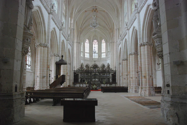 От каролингской церкви VIII века до нашего времени не дошло практически ничего. Церковь многократно разрушалась на протяжении истории и каждый раз восстанавливалась после разрушения, приобретая новые черты, главным образом, готические. Реконструкции храма, определившие его современный облик, шли с середины XIII по XVI век. В архитектуре церкви можно проследить различные этапы развития готического стиля. Длина церкви — 96 метров, ширина — 27 метров, высота — 50 метров. Фасад церкви создан в стиле пламенеющей готики в XV веке. В интерьере сохранилось несколько картин XVII века.