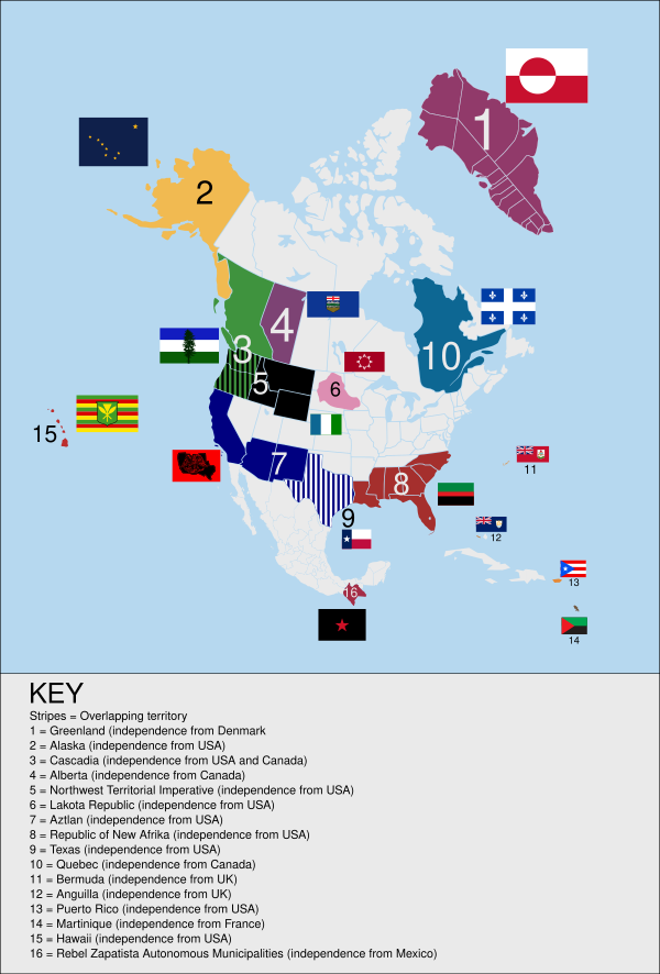 - Американский (провинция Квебек, Канада; штат Чьяпас, Мексика; Гренландия; остров Невис). Американский сепаратизм носит спокойный характер, насилие не применяется или случается крайне редко, так как коренное население малочисленно и разобщено.