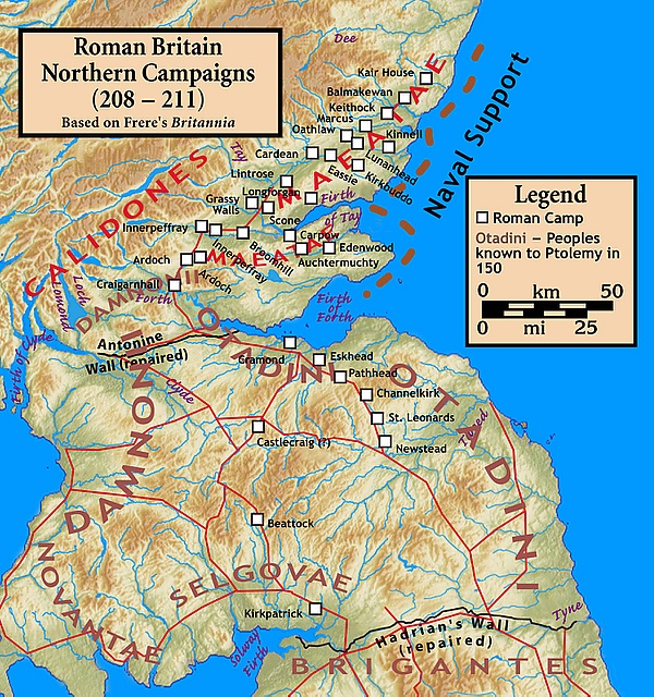 Очевидно, полномасштабная кампания началась в 209 году после того, как император назначил Гету править Британией из Эборака. Сам Луций со старшим сыном двинулся на север. Он отвоевал Южную возвышенность вплоть до вала Антонина (этот вал был заново укреплён), построил лагерь площадью 165 акров в Тримонтии, вероятно, собрав там свои силы, а потом направил свою армию дальше на север, на территорию Каледонии. Повторив поход Агриколы, он перестроил множество заброшенных римских фортов вдоль восточного побережья, таких как Карпоу, и разместил там гарнизоны[225]. В походе римлянам приходилось сталкиваться со множеством трудностей из-за лесистости территории, множества болот и рек[226]. Каледонцы снова попросили о мире, который Север предоставил при условии, что они откажутся от контроля над Центральной низменностью[227][228]. Об этом свидетельствуют обширные укрепления эпохи Севера в этом регионе[229]. Каледонцы, испытывая недостаток в припасах и чувствуя, что их положение безнадёжно, восстали в том же году, объединившись с меатами[230]; Север начал подготовку к ещё одной кампании, намереваясь на этот раз полностью истребить каледонцев. По словам Диона Кассия, он приказал солдатам: «Чтоб никто не избег от погибели чёрной и от нашей руки! Ни младенец, которого матерь носит в утробе своей, чтоб и он не избег погибели чёрной!»[231]. В 210 году начался второй поход, в котором император уже не принял участия из-за болезни (он остался в Эбораке с Гетой). Войском командовал Каракалла[232], но он, по словам Геродиана, «мало думал о войне с варварами; он старался расположить к себе войско»[233]. После смерти Септимия Севера Каракалла оставил захваченные территории и вернул границу по линии вала Адриана[234].
