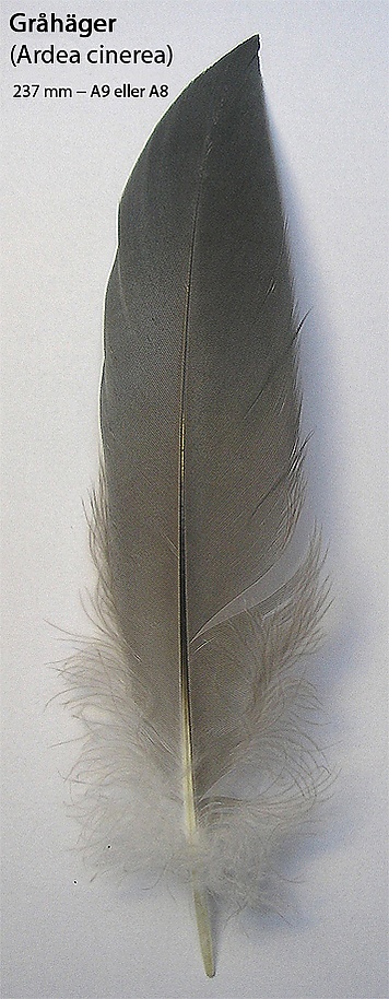 Вдоль боков туловища развиты широкие чёрные полосы. Когда у цапли сложены крылья, в районе кистевого сгиба перья образуют выделяющееся чёрно-белое пятно. Хвост серый. Для наблюдателя, мало знакомого с цаплей, отличить её от журавля легко благодаря отсутствию на хвосте длинных изогнутых покровных перьев. На груди, брюхе и в паху концы перьев постоянно обламываются и крошатся на микроскопические чешуйки, образуя своего рода пудру, которой цапля смазывает перья во избежание их слипания под воздействием постоянно попадающей на тело слизи поедаемых рыб (это так называемые пудре́тки, имеющиеся у всех цапель и некоторых других семейств птиц)[15]. Эту пудру цапля наносит при помощи удлинённого и зазубренного когтя среднего пальца[2].