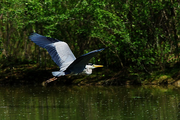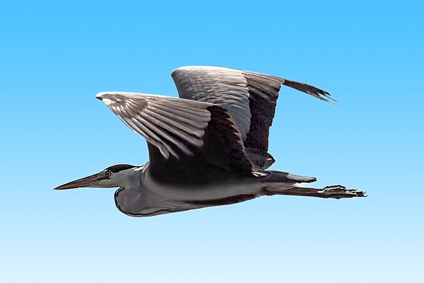 Летящую цаплю нетрудно отличить от других крупных птиц. Она складывает шею в виде латинской буквы S, так что голова оказывается на спине, и вытягивает ноги далеко за обрез хвоста. В таком положении силуэт имеет горбатый вид, с выпирающим выступом, образованным изгибом шеи. В сравнении с цаплей, у аистов и журавлей, в частности у аналогично окрашенного серого журавля, шея прямая и голова далеко выступает от остальной части тела. При взлёте цапля, особенно вспугнутая, делает быстрые взмахи крыльями, при этом ноги болтаются в воздухе. Взлетев достаточно высоко, птица переходит на медленный и плавный полёт, с размеренными движениями крыльев. Изредка она пари́т. Голос цапли обычно слышится именно на лету. Во время полёта группы цапель часто образуют клин или линию[11][13].