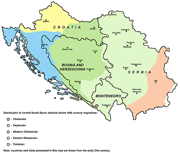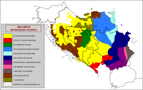 Штокавский диалект, в свою очередь, исторически делился на западную (Босния, восток Хорватии) и восточную (Сербия кроме восточной части и Черногория) зоны распространения. Миграции, усилившиеся на южнославянских землях начиная с XVI в., размыли исторические диалектные области и постепенно привели к созданию общего литературного языка на основе штокавского диалекта. Хотя единая литературная норма так и не сложилась, однако все современные официальные (литературные) нормы языков, ранее считавшихся вариантами сербохорватского (сербский, хорватский, боснийский, черногорский), основаны на штокавском диалекте.