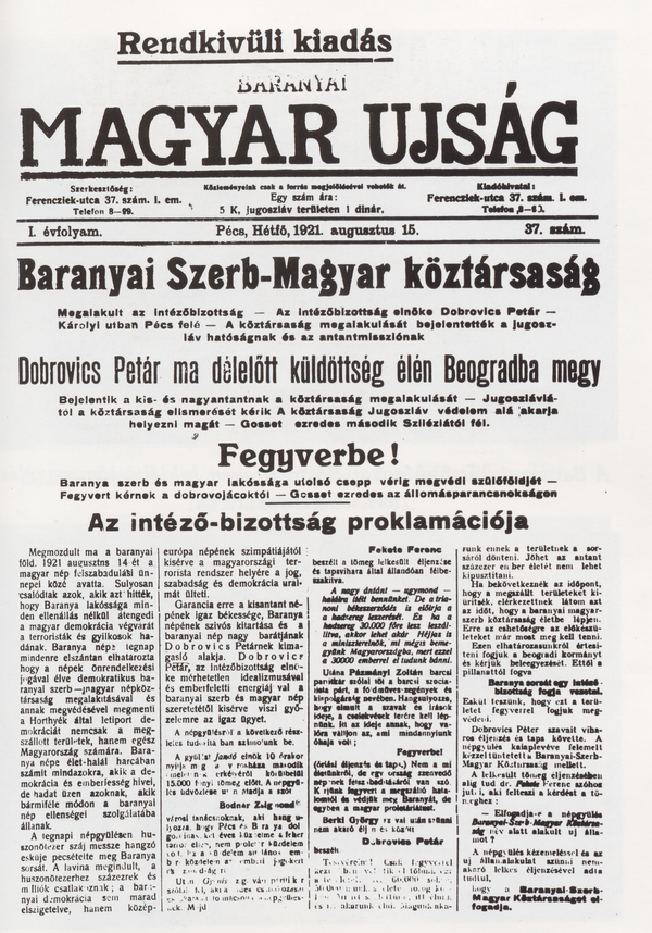 По итогам Парижской мирной конференции Баранья отошла к Венгрии, и это решение было встречено всеобщими забастовками и массовыми демонстрациями против присоединения. В итоге 14 августа на Великом народном собрании в присутствии 15-20 тыс. человек художник Петар Добрович предложил создать независимую республику, которая будет включать в себя область Баранья и некоторые близлежащие территории. Решение было принято и Петар Добрович стал президентом новой республики. Её руководство было социалистическим, но строй декларировался не диктатурой пролетариата, а широкой демократией; в республику намеревались пригласить Михая Каройи, республику поддержала как коммунистическая, так и либеральная эмиграция (например, Оскар Яси).