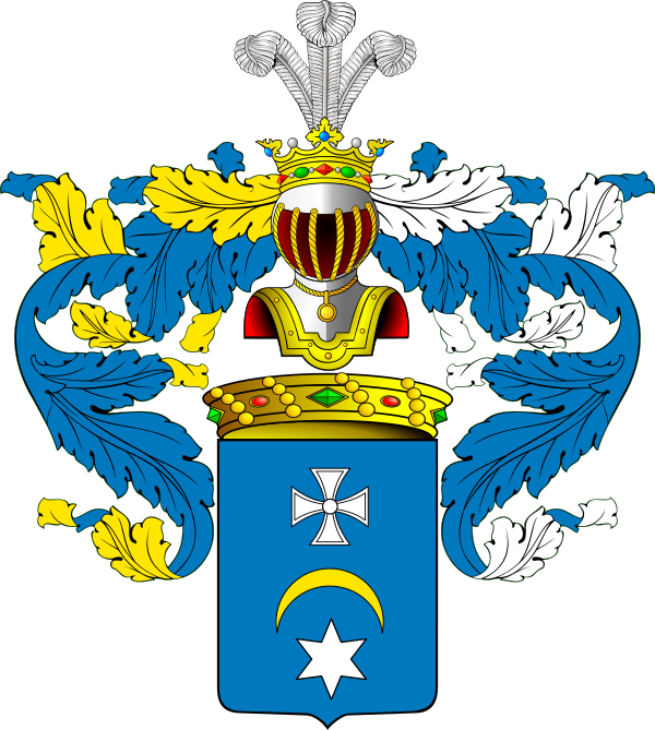В щите, имеющем голубое поле изображены серебряный крест, под ним золотая луна рогами вниз и серебряная шестиугольная звезда. Щит увенчан баронской короной, на которой поставлен шлем с дворянской короной и тремя страусовыми перьями. Намёт на щите голубой, подложенный золотом и серебром.