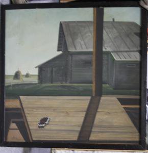 Изображение выполнено в горизонтальном формате с плоскостной, схематичной композицией. На первом плане находится доска, наклонно прислонённая к оконной раме; слева на доске изображена бабочка с расправленными крыльями, справа — тень от переплёта рамы. На втором плане представлен вид, открывающийся из окна: слева различимы далекие стога сена, справа — одноэтажная деревянная постройка с двускатной крышей. В работе преобладают градации серого и коричневого, а также зелёный и голубой цвета, что формирует характерную цветовую гамму произведения.