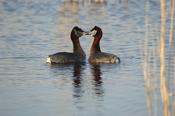 В одной из брачных церемоний самец и самка быстро плывут параллельно друг к другу, вертикально приподнявшись над водой в так называемой «позе пингвина» — с открытым наклонённым клювом и взъерошенными перьями на затылке и шее. В другом случае птицы при параллельном сближении синхронно поворачивают головы навстречу, соприкасаясь клювами. В «танце пингвина» самец и самка стоят на воде друг напротив друга, соприкасаясь грудью; при этом один из партнёров возвышается над другим. Иногда самец и самка демонстрируют друг другу кусочки травы или водорослей — поза, известная как «предъявление пищи». В ещё одной игре один из партнёров ныряет по направлению к другому, время от времени приподнимая голову над водой, в то время как вторая птица принимает «позу кошки» — горизонтальное положение на воде, при котором крылья лишь слегка раскрыты, перья на лопатках и крыльях приподняты вверх, голова втянута в плечи, хохол на затылке принимает возбуждённое состояние[32][35][36].