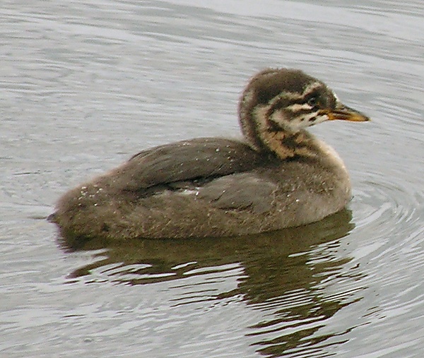 Пуховые птенцы обладают черновато-бурым, почти чёрным верхом и серовато-белым низом. По бокам головы развиты две белые продольные полоски, передняя и боковая часть шеи также с белым полосатым рисунком. Клюв желтоватый. Осенью птенцы одеваются в первый перьевой, так называемый гнездовой, наряд: он имеет много общего с зимним нарядом взрослых птиц, но отличается от него полосатым рисунком на голове (в отличие от полос пухового наряда, полосы перьевого не спускаются на шею), каштановой окраской передней и боковой частей шеи, и большим количеством жёлтого на клюве[3][10].