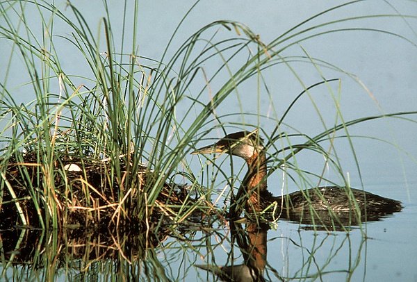 Нередко первоначальные гнёзда (возможно ложные, предназначенные лишь для спаривания), построенные на более открытом месте вскоре после прилёта, разрушаются вследствие сильного волнения воды. Гнездо достаточно громоздкое и полностью пропитано водой, к тому же большая его часть находится ниже ватерлинии, днищем касаясь дна. По данным российских источников, диаметр гнезда достигает 309—450 мм, диаметр лотка 155—200 мм, общая высота 225—480 мм, высота над водой 30—50 мм[37]. Строительством занимаются обе птицы пары в течение 5—6 дней, собирая материал в радиусе 4—6 м от гнезда с поверхности воды. В центре гнезда материал укладывается крест-накрест, с краёв по окружности[37].