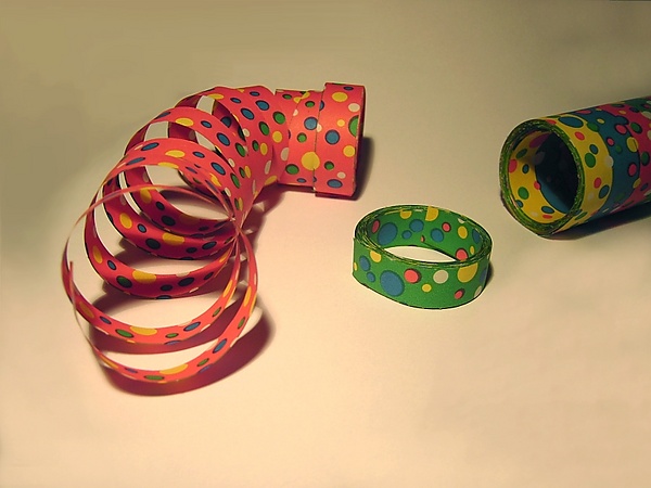 - Бумажный серпантин: Классический вид. Изготавливается из тонкой цветной бумаги, которая на специальных станках нарезается и скручивается в спирали. Главный недостаток — хрупкость и непрочность.