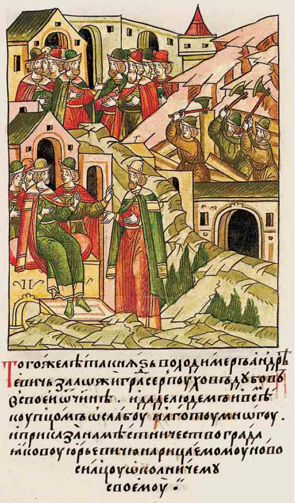 По духовной грамоте третий сын Ивана Калиты Андрей Иванович унаследовал часть земель Московского княжества, в том числе Серпухов, ставший центром волости, а в будущем — основой нового удельного княжества. В середине XIV века по Европе прокатилась эпидемия чумы, известная как «чёрная смерть». Князь Андрей пал одной из её жертв в 1353 году. Удел переходит по наследству князю Владимиру Андреевичу. В период малолетства князя владениями управляют влиятельные бояре. В это время в истории города происходит знаменательное событие — московским митрополитом Алексием в 1360 году на правом берегу Нары основан Владычный монастырь. В 1367 году с целью урегулирования отношений между Владимиром и его двоюродным братом Дмитрием подписан договор, по которому подтверждается подчинённость первого второму, а также права Владимира Андреевича на его удел и обязанности по отношению к московскому князю.