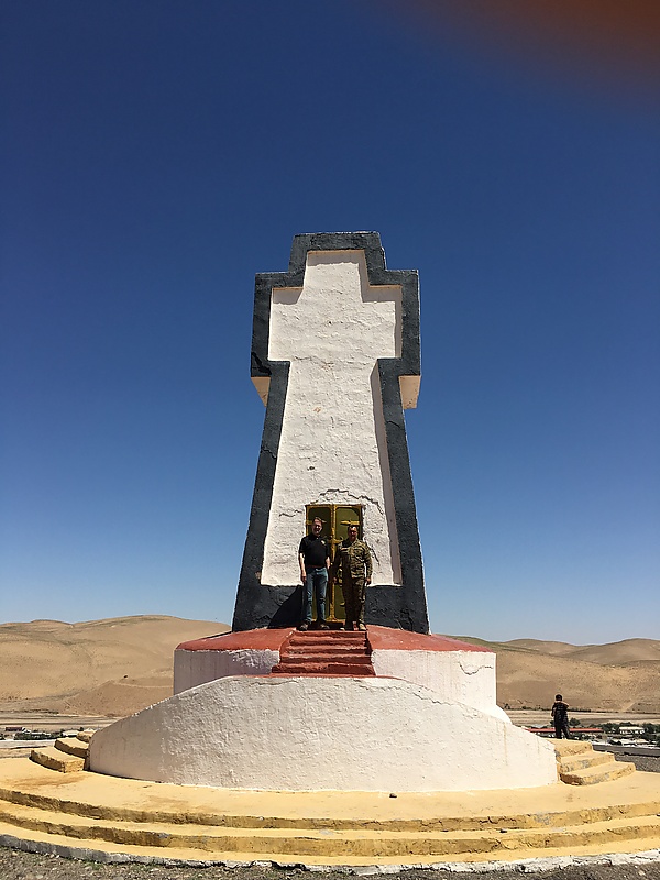 На одной из самых высоких сопок стоит 10-метровый каменный крест, обозначавший крайнюю южную точку Российской империи, установлен к 300-летию дома Романовых на пожертвования военнослужащих Кушкинского гарнизона; позднейшие упоминания о будто бы задуманных для трёх других крайних точек империи аналогичных монументах сугубо легендарны.[6] На противоположной сопке находится памятник советскому солдату-освободителю высотой 16 метров. Сооружён в 1963 году.