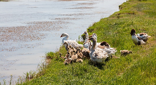 - IBC: пара Anser anser с четырьмя птенцами на лугу в Австрии