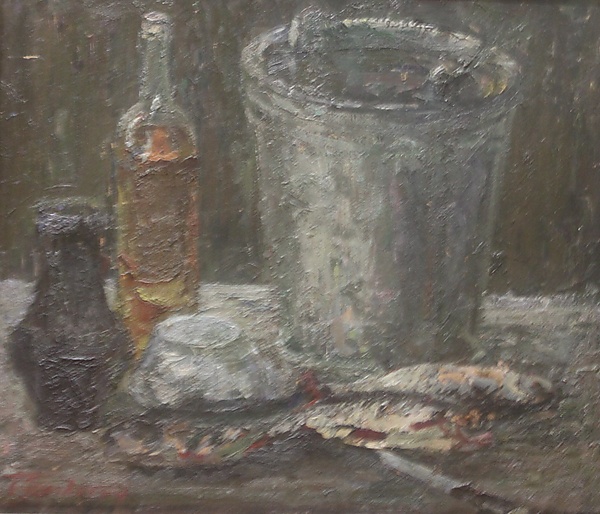 На полотне изображены крупные предметы, размещённые на столе: большое ведро, слева от него — бутылка с жёлтой жидкостью, чёрный кувшин и круглая чашка. В нижней части композиции расположены три рыбы, а в правом углу по диагонали лежит нож, остриём направленный к одной из рыб. Общий колорит работы выдержан в серо-зелёных тонах цветовой гаммы, живопись выполнена в технике пастозной живописи.