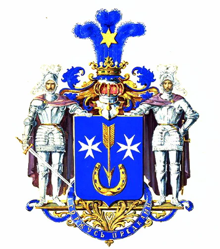 В лазуревом щите, золотая опрокинутая в столб стрела, сопровождаемая по бокам двумя серебряными Мальтийскими крестами, а в оконечности — золотою подковою шипами вверх. Щит увенчан Дворянским коронованным шлемом. Нашлемник: три лазуревых страусовых пера, из коих среднее обременено золотою о шести лучах звездою. Намёт: лазуревый с золотом. Щитодержатели: два рыцаря в серебряных латах, с серебряными перьями на шлемах; правый рыцарь держит в руке серебряный с золотою рукоятью меч. Девиз: «Горжусь предками», золотыми буквами на лазуревой ленте.