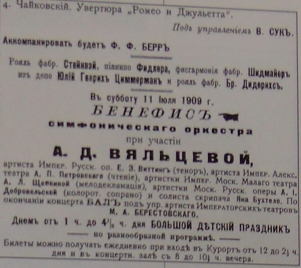 Летом концерты давались на двух сценах: днём на открытой эстраде выходившей в парк, а вечером в концертном зале. Сук не любил дневные выступления из-за худшей акустики открытой сцены и отвлекающих звуках (шелест волн, голоса дачников, шум ветра…). Дирижировать этими концертами он поручал своим ученикам Малько Н. А., Борису Асафьеву, а сам с блеском выступал вечером в концертном зале. Все десять сезонов набирал оркестр по директиве В. И. Сука флейтист Мариининского театра Ю. И. Федерганс.