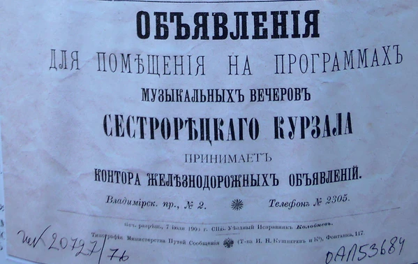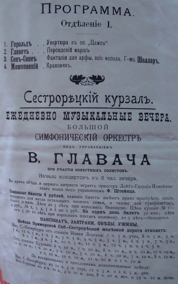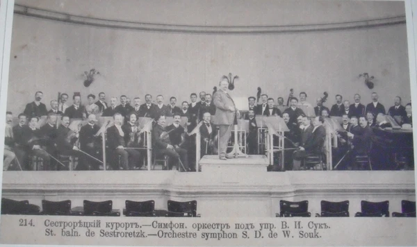 В 1901 и 1903 годах летом в Курзале работал симфонический оркестр графа А. Д. Шереметева под управлением Владимирова. Со дня открытия Курорта летом в Курзале и в парке играли Симфонический оркестр и духовые оркестры полков столичного гарнизона. Администрация Курорта заключила договор с Вячеславом Ивановичем Суком, главным дирижёром Московской Императорской оперы (современный Большой театр — ГАБТ). Вячеслав Иванович обязался вести симфонические сезоны в Курзале Сестрорецкого Курорта, оговорив себе право собрать состав оркестра по своему усмотрению. На первом концерте исполнялись произведения Бетховена, Чайковского. Столичная публика устремилась в Курорт. Несмотря на полуторачасовую дорогу из центра города, и езду в тряских вагонах поезда, публика заполняла концертный зал, вмещавший до 1700 человек. Композиторы России начала века считали за честь получить согласие Сука на первое исполнение их произведений: Римский-Корсаков Н. А., Глазунов, Цезарь Кюи, Лядов А. К., Давыдов К. Л. и их многочисленные консерваторские ученики. Концерты давали четыре раза в неделю, и так десять летних сезонов подряд. Для детей устраивались дневные праздники (утренники) и танцы по четвергам. Из СПб в Курзал ходили специальные «концертные» поезда[1].