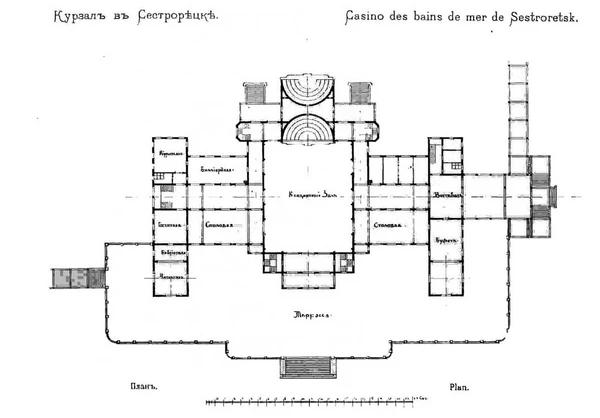 В левом флигеле курзала находились библиотека, бильярдные и карточные комнаты, гостиные для отдыха и тихих игр. Перед курзалом, со стороны залива, была устроена терраса с парадной лестницей, выложенной серым гранитом, спускавшейся на пляж.