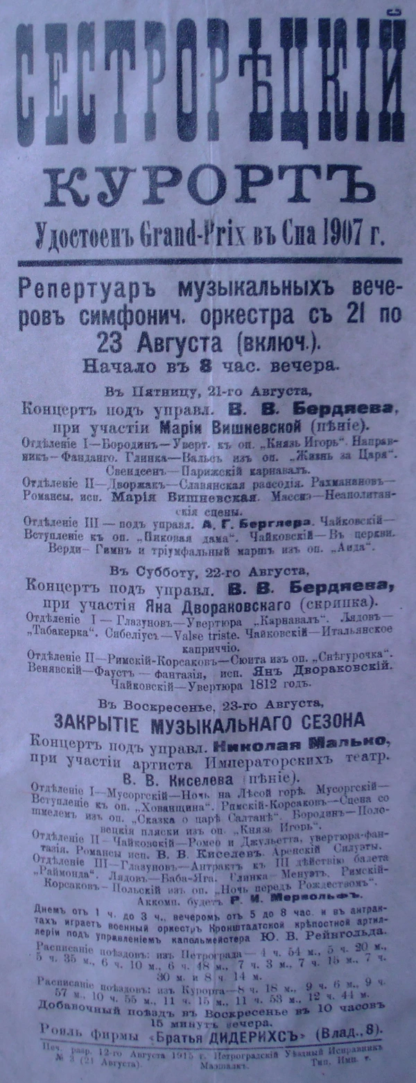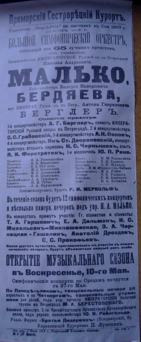 После начала Первой мировой войны в сезон 1915 года Сук не продлил свой договор с новым руководством Курорта и в этот год оркестром руководил Н. А. Малько, а затем в курзале выступали цыгане[3].