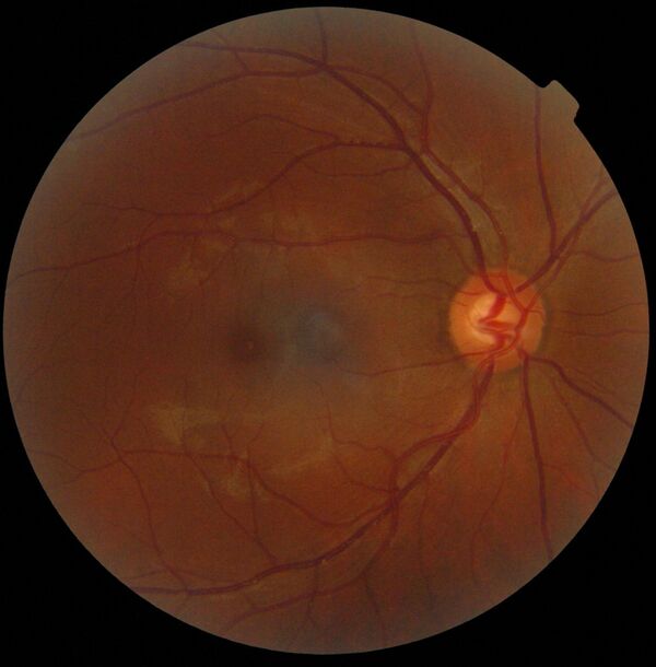 Около центра сетчатки (ближе к носу) на задней её поверхности находится диск зрительного нерва, который проецируется с височной стороны. Из-за отсутствия в этой части фоторецепторов эту зону называют слепое пятно или пятно Мариотта. Диск зрительного нерва выглядит как бледная, округлой формы, зона около 3 мм². Здесь из аксонов ганглионарных нейроцитов сетчатки происходит формирование зрительного нерва. В центральной части диска имеется углубление, через которое проходят сосуды, участвующие в кровоснабжении сетчатки.