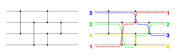 Часто изображаются в виде сети, горизонтальные линии в которой соответствуют передаче сортируемого элемента слева направо, а вертикальными соединениями пар линий обозначены так называемые «модули компараторов», имеющие два входа и два выхода. Модуль компаратора производит сравнение элементов на входе и обменивает их местами таким образом, чтобы на нижнем выходе было, например, большее число. Сети сортировки допускают эффективную аппаратную реализацию.