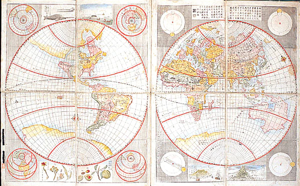 Карта мира труда Сиба Кокана опубликована в 1792 году в двух рукописных листах, показывает в окружающих диаграммах рисунки Коперника с Землей, Солнцем и Луной.