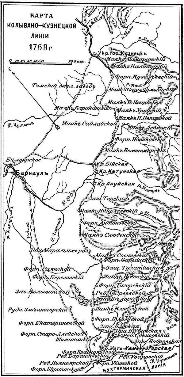 - Колывано-Кузнецкую (1747—1768 гг.) укреплённые линии[2].