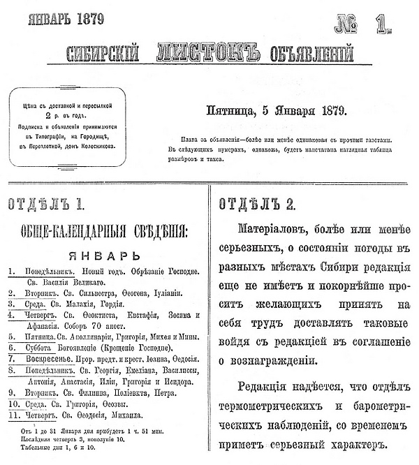 До 1879 года в Тобольской губернии выходила только одна газета — «Тобольские губернские ведомости». В 1879 году тюменский издатель Константин Высоцкий начал выпускать частную газету «Сибирский листок объявлений». Газета выходила еженедельно, по пятницам с 5 января по 28 декабря. В каждом номере было четыре полосы. Подписная цена вместе с пересылкой равнялась 2 рублям (для сравнения цена «Тобольских губернских ведомостей» составляла 4 рубля без пересылки). Издатель намеревался «отражать все интересы Сибири и её деятельности на почве как крупной промышленности, так и её главных отраслей». Для издания использовались разные, в том числе иностранные, шрифты.