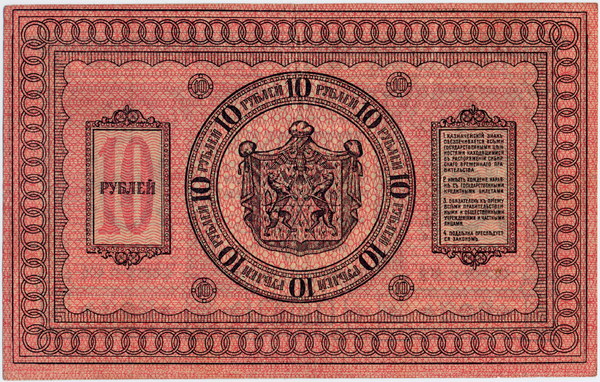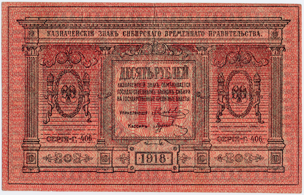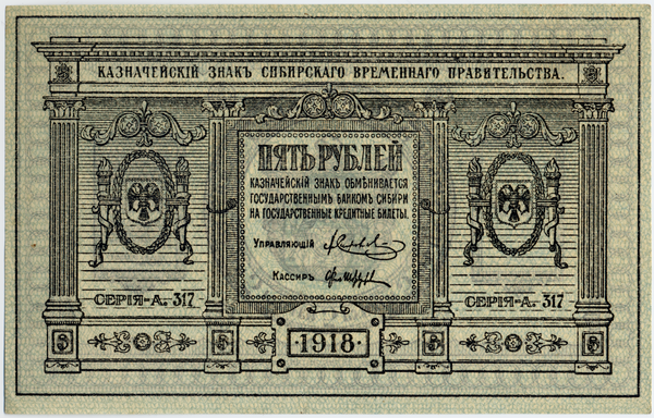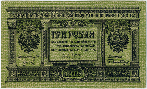 Ещё до провозглашения Колчака Верховным правителем России Временное Сибирское правительство выпустило пятипроцентные краткосрочные обязательства государственного казначейства Сибири достоинством в 500, 1000 и 5000 рублей и казначейские знаки — в 1, 5 и 10 рублей. При А. В. Колчаке к ним добавили казначейские знаки номиналом в 3 и 300 рублей.