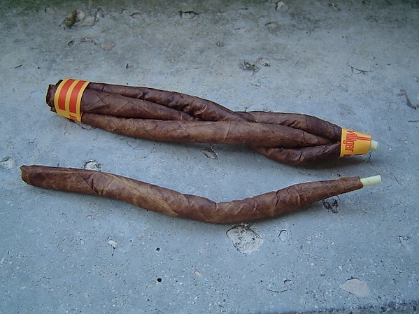 - Machine. Сигары машинной скрутки производят на фабриках со специальными станками. Они бывают двух типов: с наполнителем из цельных листьев (достаточно редкое явление) и с наполнителем из резаного табака. Сигары второго типа составляют подавляющее большинство продающихся на рынке сигар. Для машинного способа производства сигар используются менее благородные сорта табака. Листья, применяемые в качестве покровных, не выглядят так привлекательно, как те, что идут на более дорогие сигары. Чтобы придать им более презентабельный вид, производители используют различные ухищрения, например, покрывают сигару тонким слоем из раствора табачного порошка. Часто в такие сигары добавляют различные ароматизаторы: шоколад, вишню, ваниль и другие.