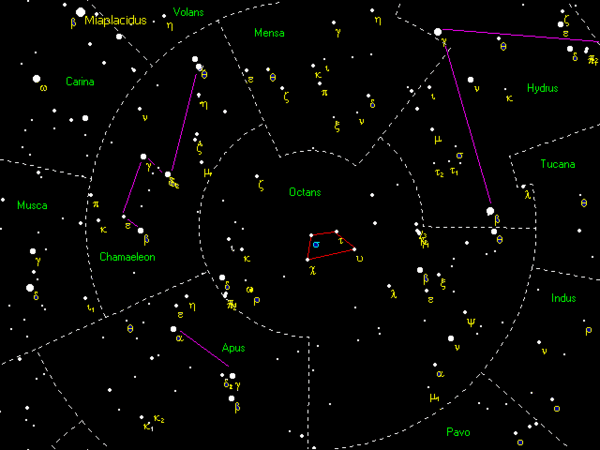 Звезда располагается вблизи Южного полюса мира, и, следовательно, играет в Южном полушарии роль поляриссимы, как Полярная звезда в Северном полушарии. Для наблюдателя в Южном полушарии (звезда не восходит севернее 1° с.ш), Сигма Октанта всегда остаётся практически неподвижна, а все остальные звёзды южного неба вращаются вокруг неё в течение суток, поэтому иногда она называется Южная Полярная звезда[7]. Однако в отличие от Полярной звезды, Сигма Октанта с трудом видна невооружённым глазом и не используется в навигации[8][9]. Расстояние от звезды до Южного полюса мира чуть больше 1°, но последний постепенно удаляется от звезды вследствие прецессии.