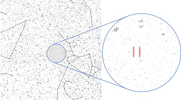 При переводе в эпоху J2000.0 координаты соответствуют ПВ= 19ч 25м 31с ± 10с (или 19ч 28м 22с ± 10с) и склонению −26° 57′ ± 20′. Эта область неба находится в созвездии Стрельца, примерно в 2,5 градусах к югу от звёздной группы пятой величины χ Стрельца.