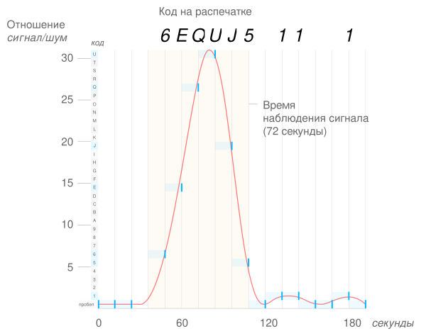 Обведённый код 6EQUJ5 описывает изменение интенсивности принятого сигнала во времени. Каждая строка на распечатке соответствовала 12-секундному интервалу (10 секунд собственно прослушивания эфира и 2 секунды последующей компьютерной обработки). С целью экономии места на распечатке интенсивности кодировались алфавитно-цифровыми символами: пробел означал интенсивность от 0 до 0,999..; цифры 1—9 — интенсивности из соответствующих интервалов от 1,000 до 9,999…; интенсивности, начиная с 10,0, кодировалось буквами (так, 'A' означала интенсивность от 10,0 до 10,999…, 'B' — от 11,0 до 11,999…, и т. д.). Буква 'U' (интенсивность между 30,0 и 30,999…) встретилась лишь единожды за всё время работы радиотелескопа. Интенсивности в данном случае являются безразмерными отношениями «сигнал/шум»; за интенсивность шума в каждой полосе частот принималось усреднённое значение за несколько предшествовавших минут[8].